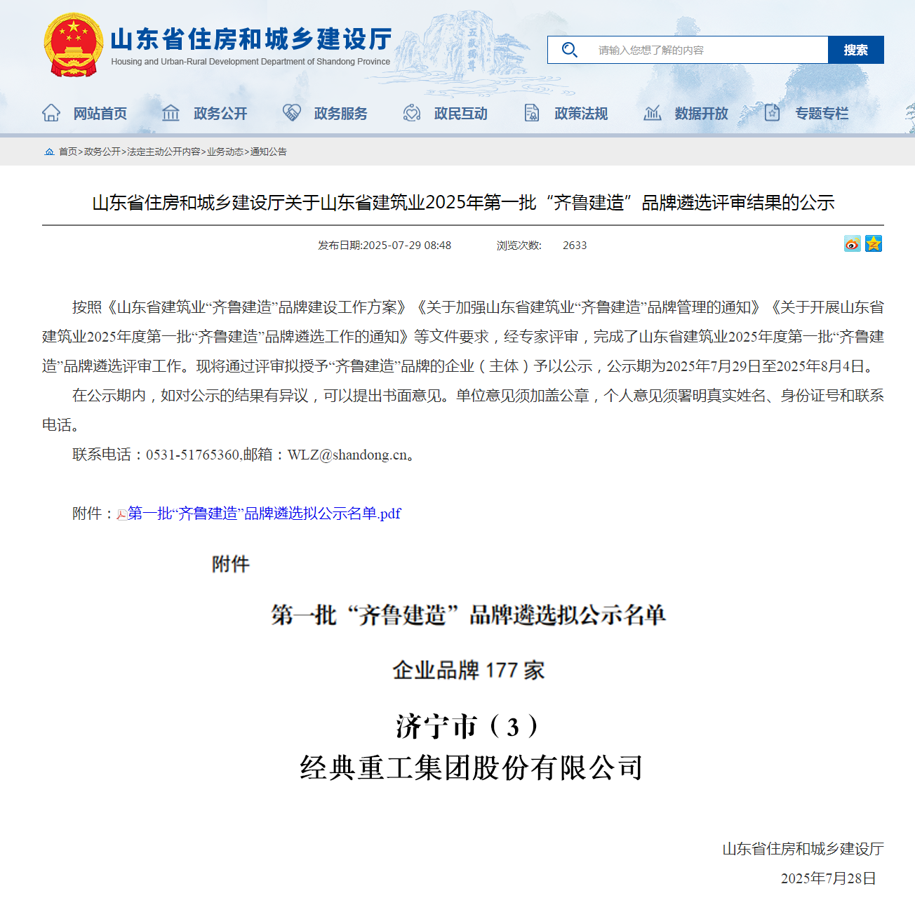近日,山東省住房和城鄉(xiāng)建設(shè)廳正式公布2025年第一批“齊魯建造”品牌遴選名單,經(jīng)典重工集團股份有限公司憑借在鋼結(jié)構(gòu)建筑部品建材領(lǐng)域的技術(shù)實力與品牌影響力,成功入選部品建材品牌名錄,這標(biāo)志著公司在推動建筑產(chǎn)業(yè)現(xiàn)代化、智能化、綠色化發(fā)展方面的綜合實力又獲省級權(quán)威認(rèn)可。2025-08-06